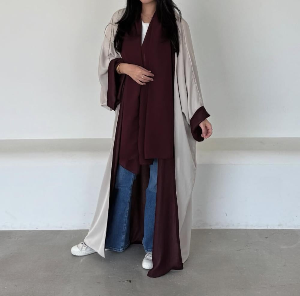 درجات البيج الناعمة تمتزج بانسيابية مع الماروني الغني، في قصة أنيقة تمنحك إحساسًا بالاحتراف والراحة معاً. اللونين يعكسان ذوق كلاسيكي محترم يليق بالمرأة العملية.